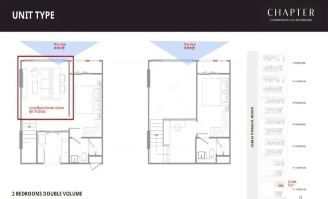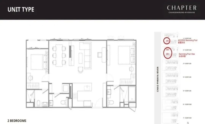 户户配阳台,大开窗设计直面或对两侧湄南河景及内园泳池景观、夕阳水景尽收眼底