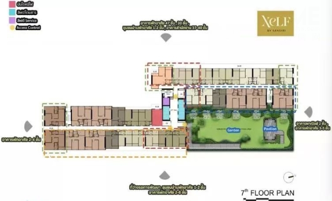 XELF by Sansiri只有一个出入口,位于拉玛四路。该项目的公共区域分布在7、33、34和35层,所有公共区域均面向拉玛四世路及其西侧,毗邻空置区域,以便住户充分欣赏城市景观。项目提供单层公寓和挑高公寓两种房型。