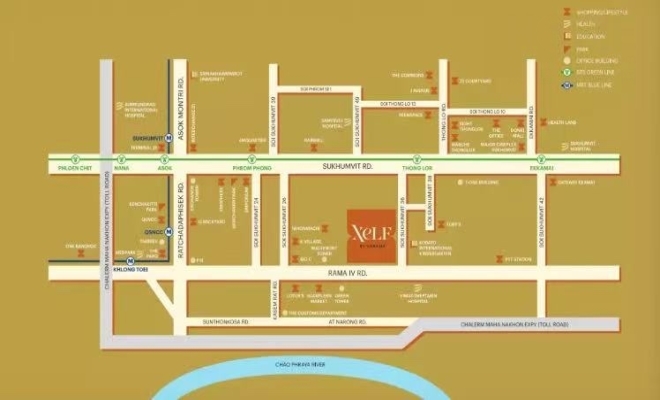 XELF by Sansiri位于拉玛四世路 (Rama IV Road),这条主干道汇聚了购物中心、酒店、医院、办公楼、公园和知名教育机构,包括One Bang、Silom Edge、Med Park、Dusit Central Park、FYI Center、Maleeont Building、T-One和诗丽吉王后国家会议中心。