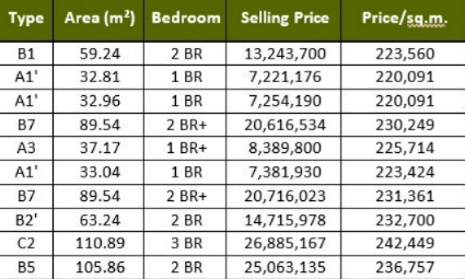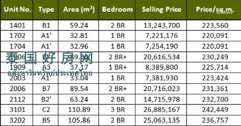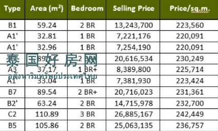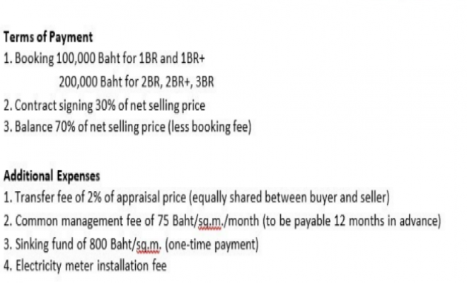 订金:1BR 和 1BR+ 为 100,000 泰铢;2BR、2BR+、3BR 为 200,000 泰铢