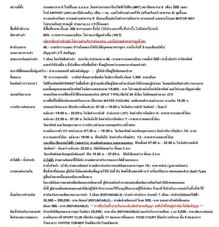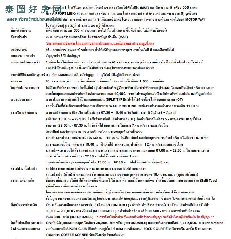 600泰铢/平方米/月(不含增值税 VAT)